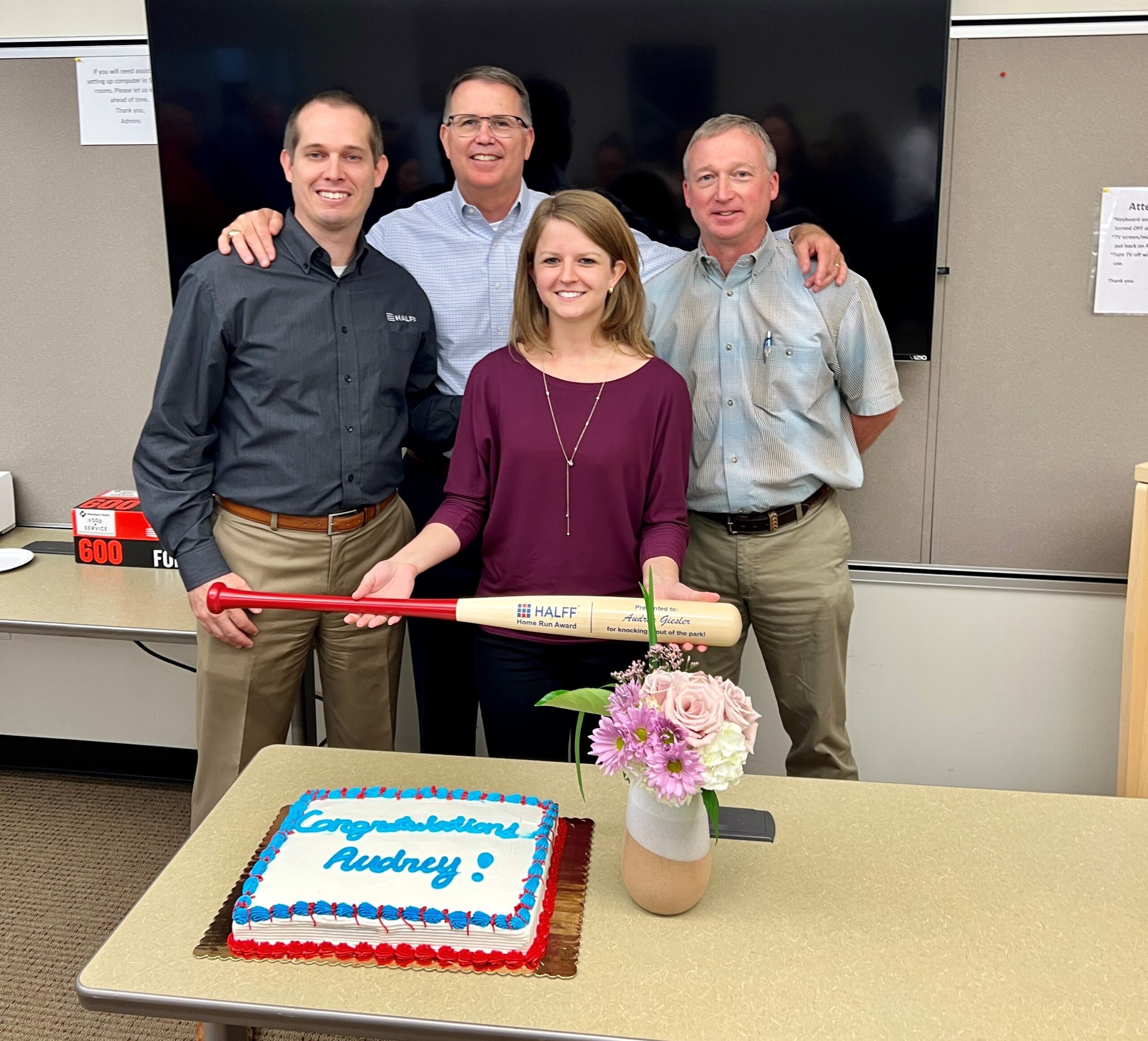 Halff President/CEO Mark Edwards (middle left) presents the Home Run Award to Audrey Giesler (middle right).